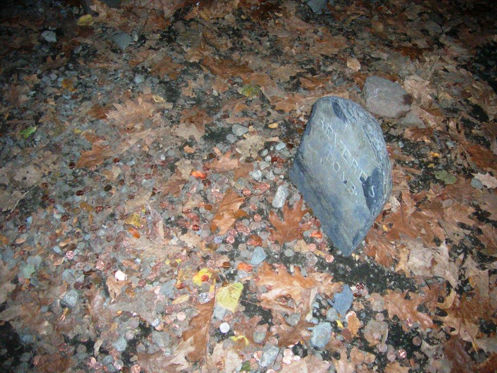רק בלילה גיליתי שלצד האנדרטה נמצאת מצבה קטנה, והיא הקבר האמיתי. שימו לב למטבעות הרבים שפזורים בין העלים.