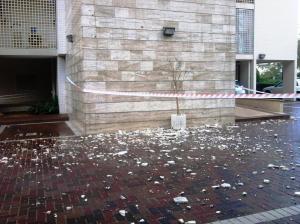 מערכה ראשונה: לפני כשבועיים, בזמן הסערה הגדולה, צנחו כמה אריחים מהקיר החיצוני של הבניין שלי (למעשה, לא כולו שלי, רק דירה אחת, וגם היא לא בדיוק שלי כי מחצית שייכת לבנק משכן, אבל זו לא הפואנטה). אץ רץ אחד מחברי ועד הבית, שחשש לראשיהם של דיירי הבניין, ותלה שלטים המזהירים את הדיירים שלא יחרפו את נפשם ויעברו "באופן רגלי או במכונית" מתחת לקיר השבור.