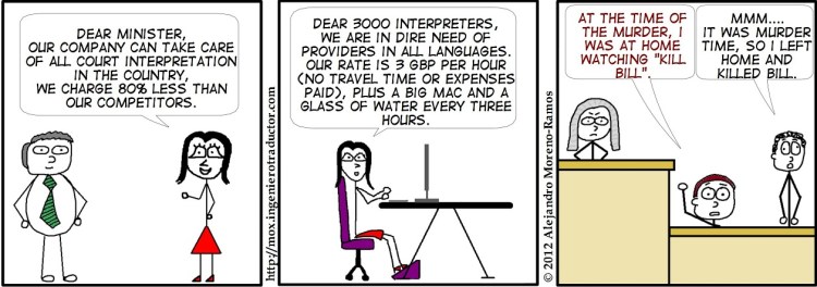 הקריקטורה נהדרת! אני מיד מכניסה אותה למצגות שלי על תרגום בבתי משפט. היא קולעת בדיוק לניסיונות שלי לשכנע את החשכ"ל לקבוע תשלום מינימום למתורגמנים. תודה רבה אינגה!