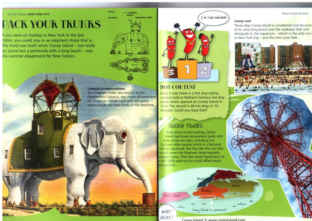 המדריכים הם של לונלי פלנט, יקראו בעברית (שם זמני) אין כניסה להורים, ויש כאמור ארבעה בסך הכול: רומא, פאריז, לונדון וניו יורק. אז למה אני מספרת לכם את זה? כי ארבעת המדריכים הדקיקים הללו גם הסבו לי הנאה וגם הדירו שינה מעיניי בחודש האחרון – ואני עדיין צריכה לשפצר ולשפץ  אותם. הם עמוסים לעייפה במשחקי מילים ובחידודי לשון. הנה שתי דוגמאות מכפולת עמודים אחת במדריך ניו יורק: