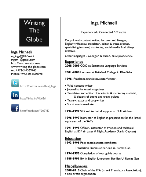 בעניין זה, יש לציין את החשיבות הרבה של קורות חיים מקצועיים. גם אם הם לא הכי יצירתיים והכי מעוצבים בעולם, ודאו שהם כתובים נכון וכוללים את כל המידע החיוני. חשוב מאוד: דאגו שבשם הקובץ יופיעו השם שלכם + צירוף השפות שלכם, ושלא קראתם לו סתם CV_2014  או "קורות החיים שלי", ולעולם אל תכתבו שאתם יודעים לתרגם הכול מאנגלית-לעברית. אין אף מתרגם שיודע לתרגם הכול, מספרות יפה ועד דוחות פיננסיים. שקלו היטב את התחומים שאתם מבינים בהם (גם אם הם מגוונים) ובחרו לעצמכם נישה שתרצו להתמחות בה ושמבדילה אתכם מכל השאר.